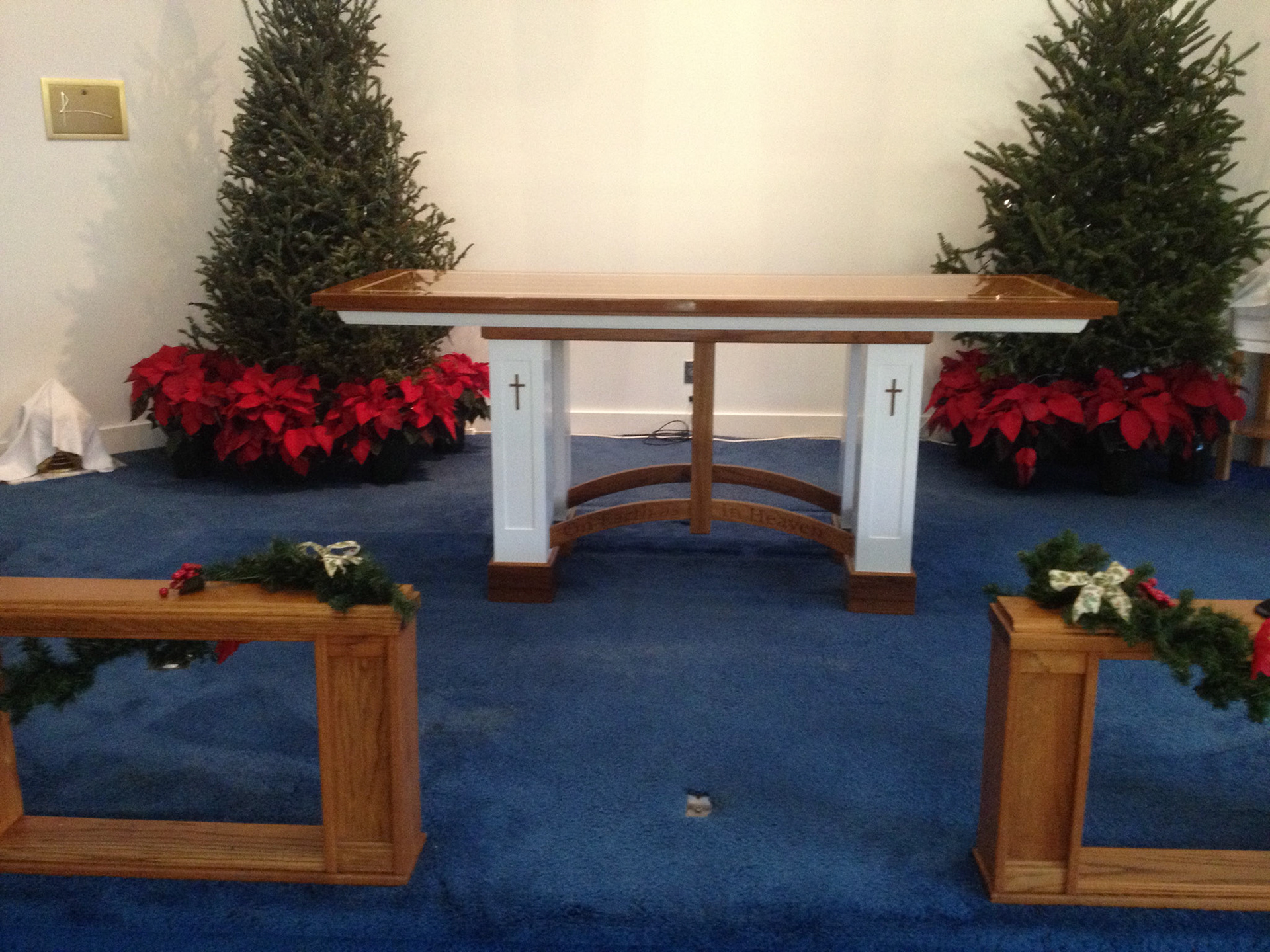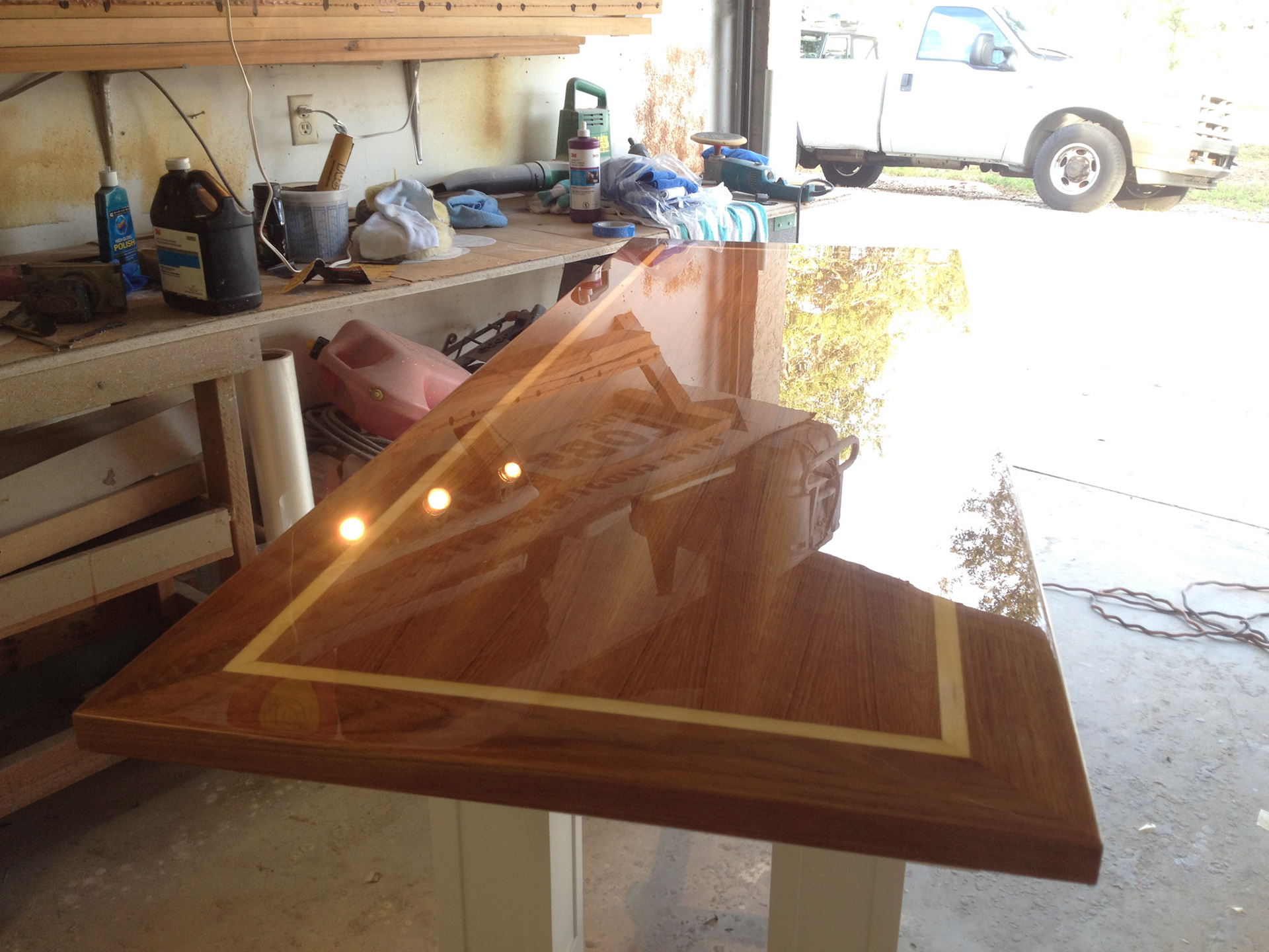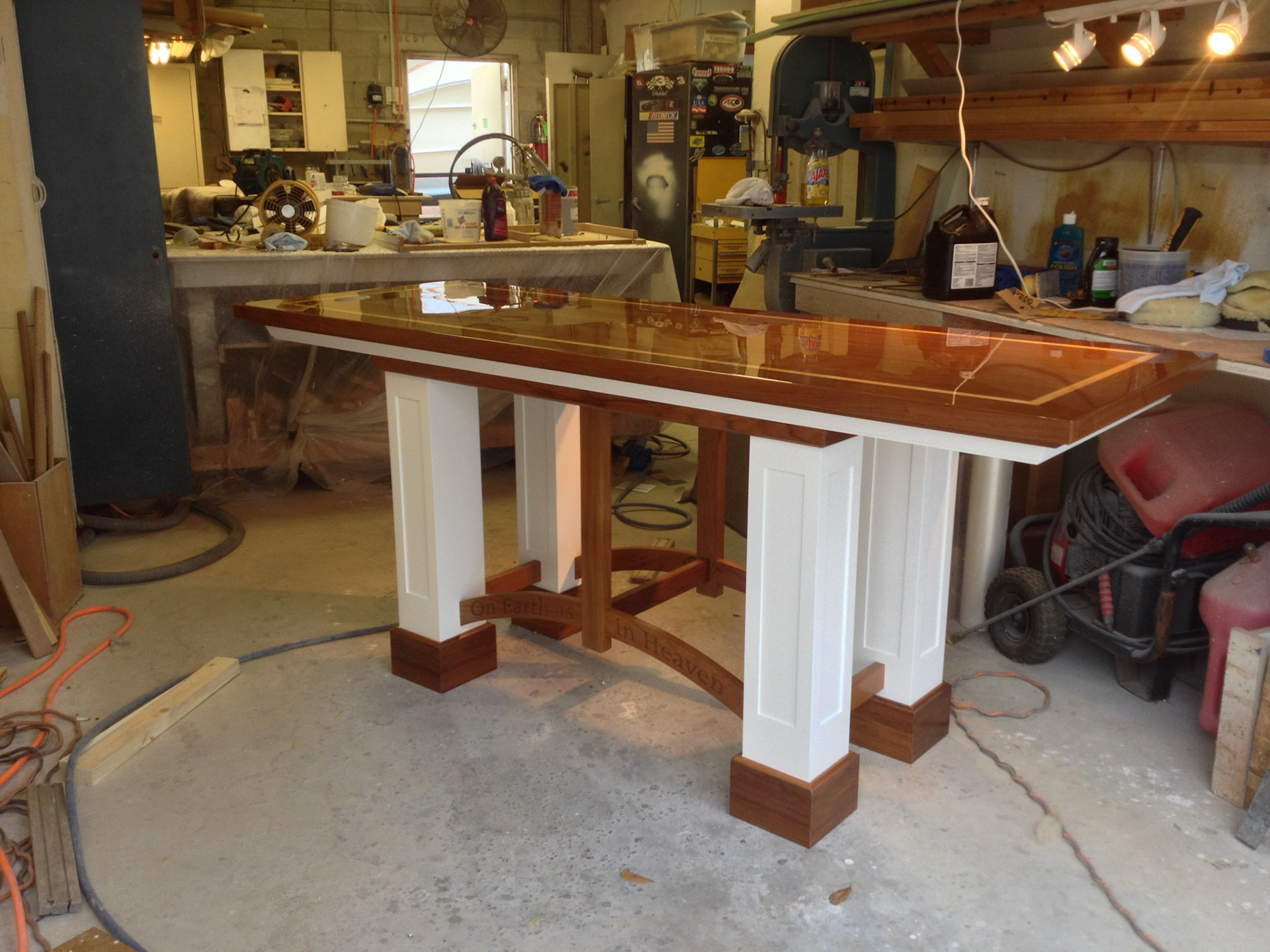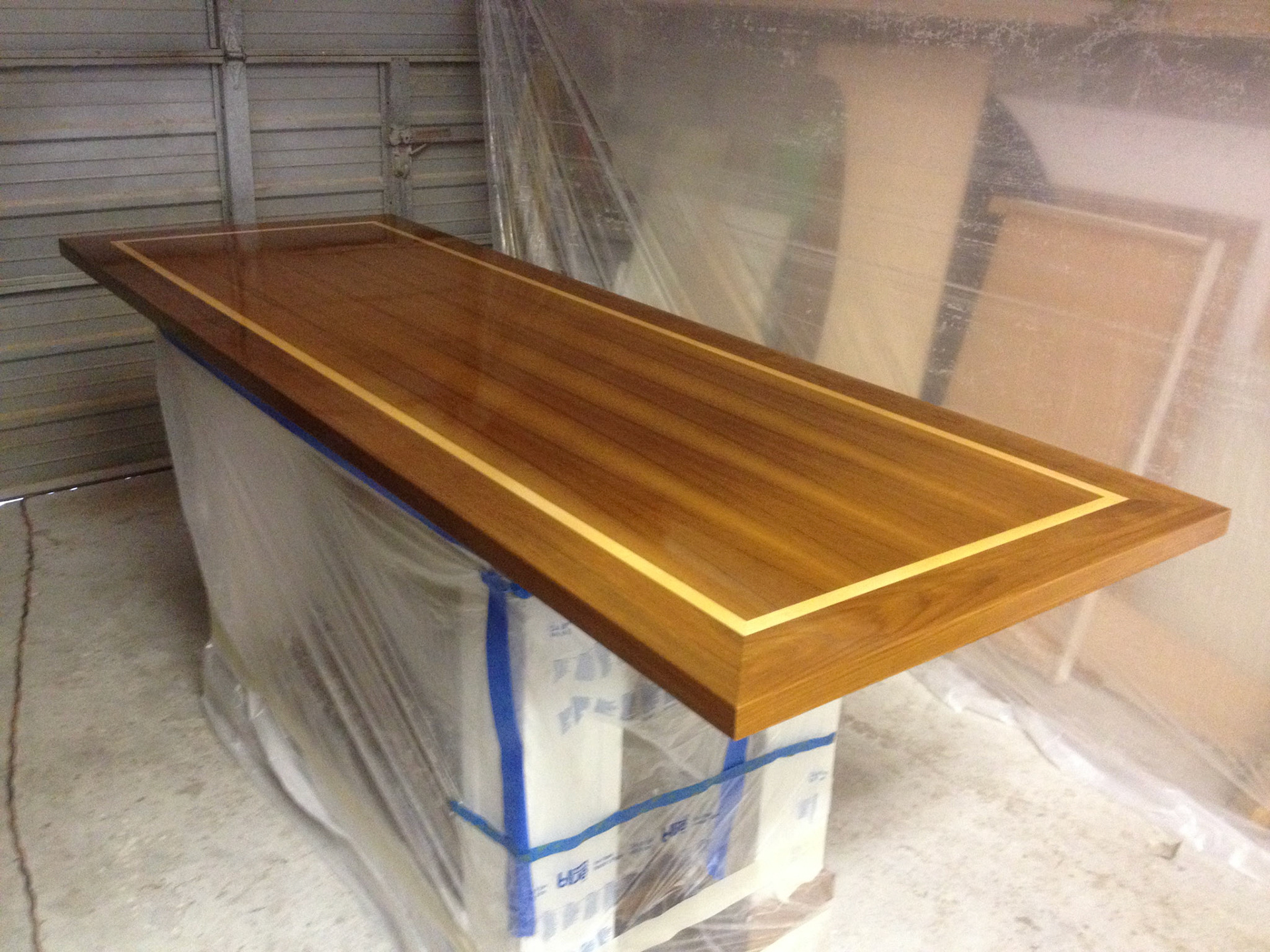 I designed and crafted this for one of my best Yacht customers Dr Richard A Scheuing. The top and trim are solid Teak with an inlay of Maple. We worked closely together for about 20 years until his recent passing. I started out working on his Grand Banks and evolved into doing many custom works for his home and church. He believed in my ability from the beginning and I'm grateful I had the opportunity to craft these pieces for him and his wonderful wife Doris who passed on one year prior. This piece was dedicated to her.