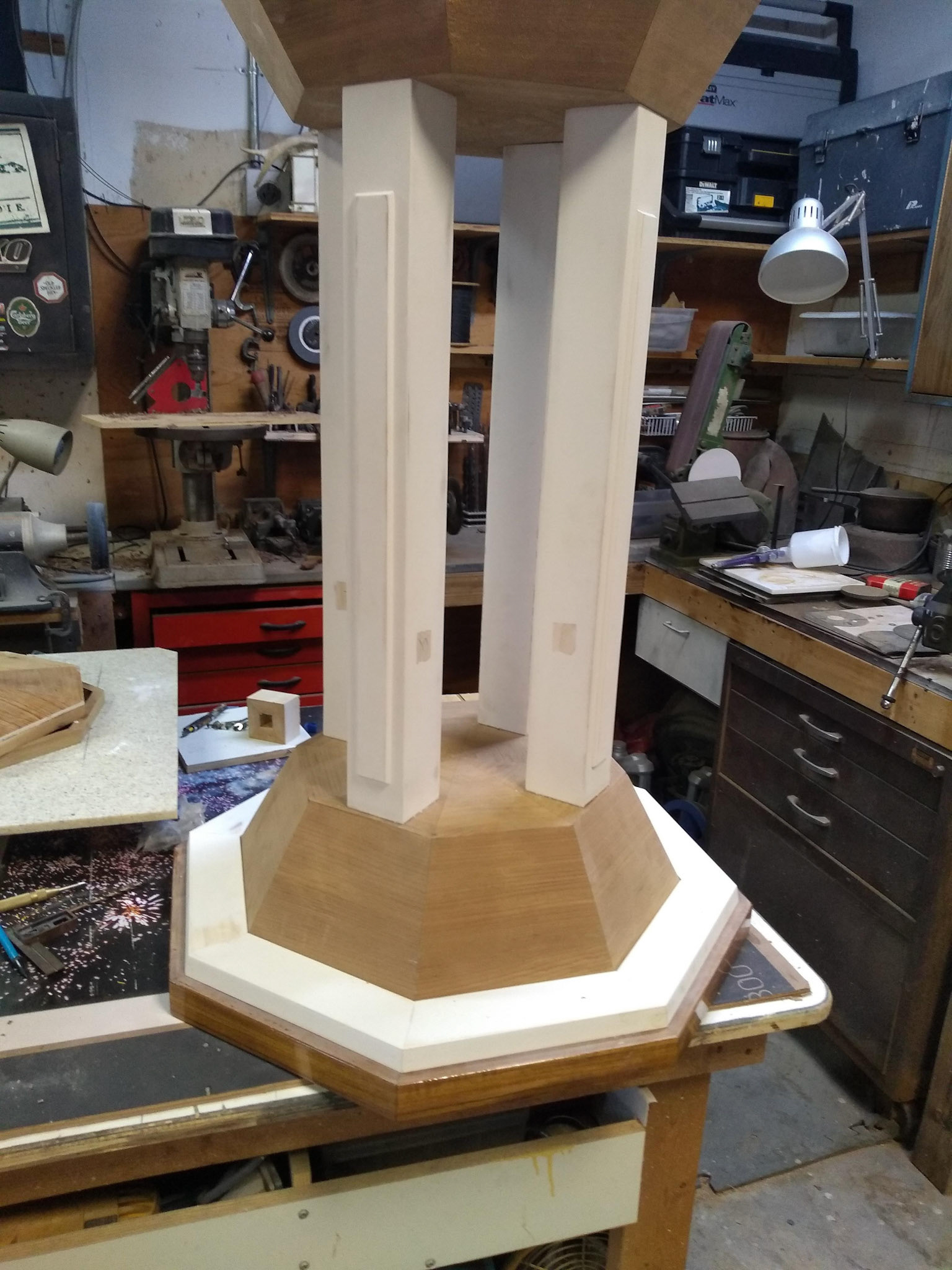 This is the final piece I've done for Dr. Scheuing. and one of the most challenging. It is again built along the lines of the Altar and railings. The octagonal pieces had to be spot on with each other to bring this piece into perfect symmetry. The first picture is a full size mock-up. These mock-ups are always standard procedure on these jobs as I feel its very important to have a visual before the actual build begins. I implement that into most all of my jobs. With a drawing alone you just can't always get a visual for what the finished piece will be aesthetically and proportionately. I work closely with my customers to provide that.